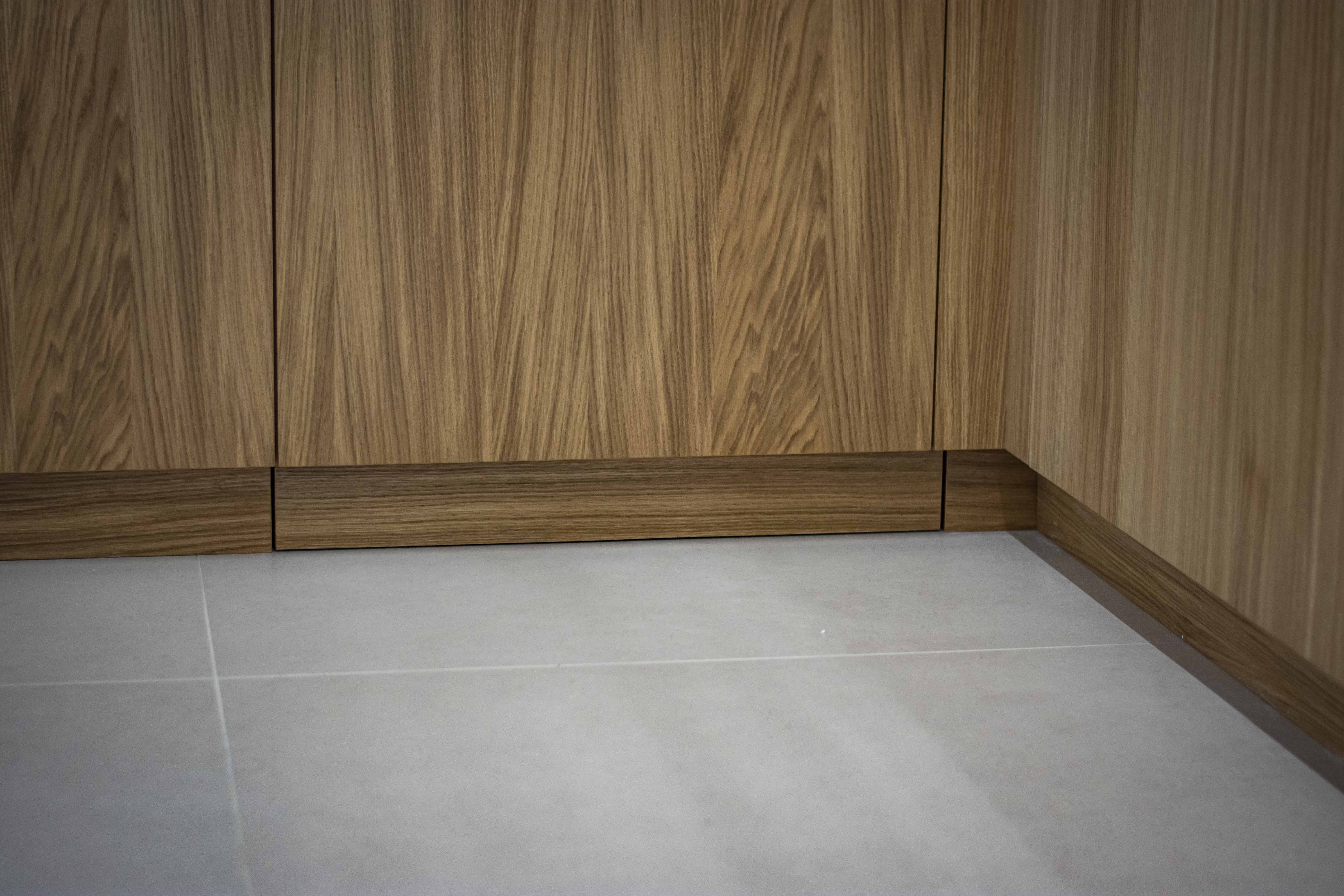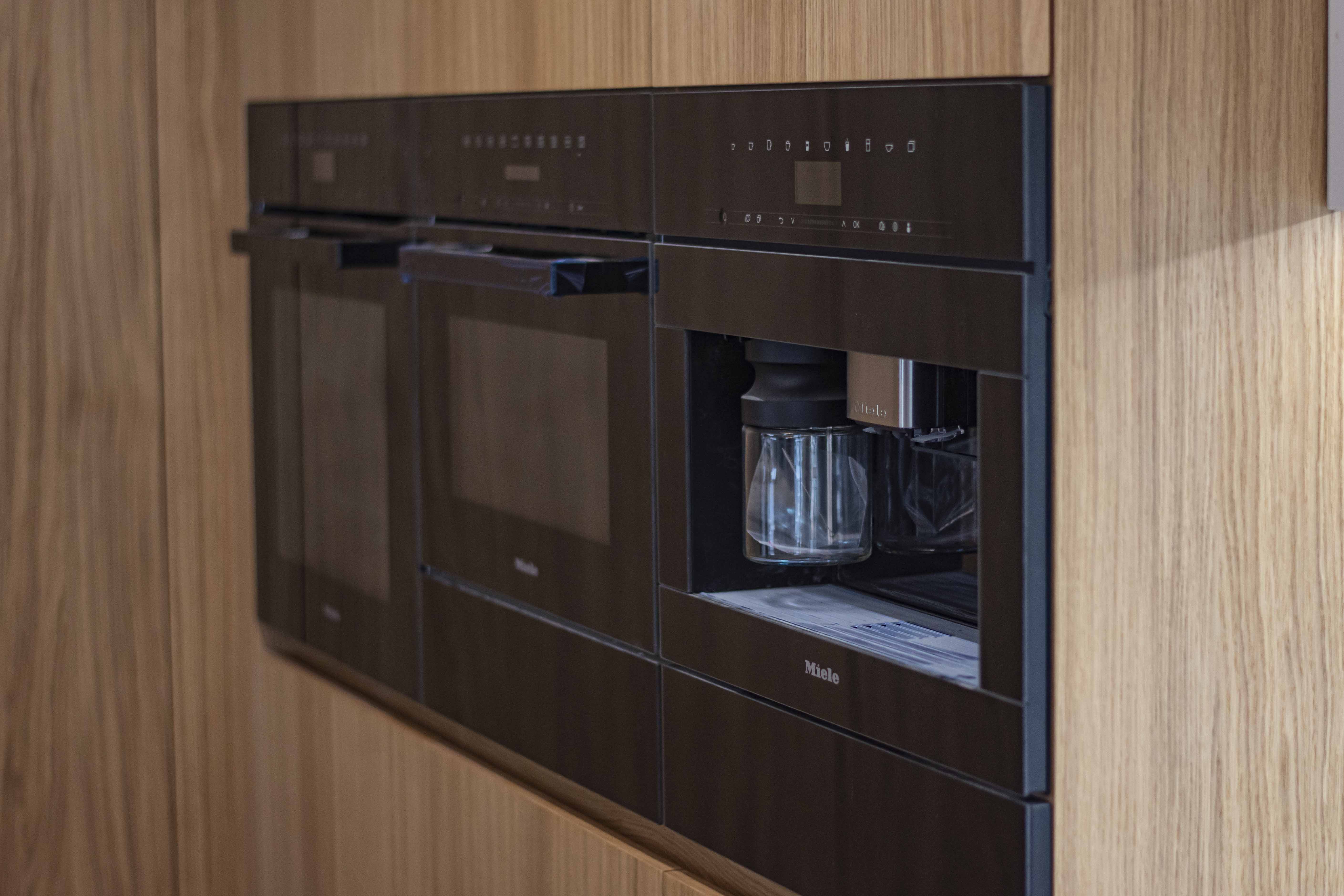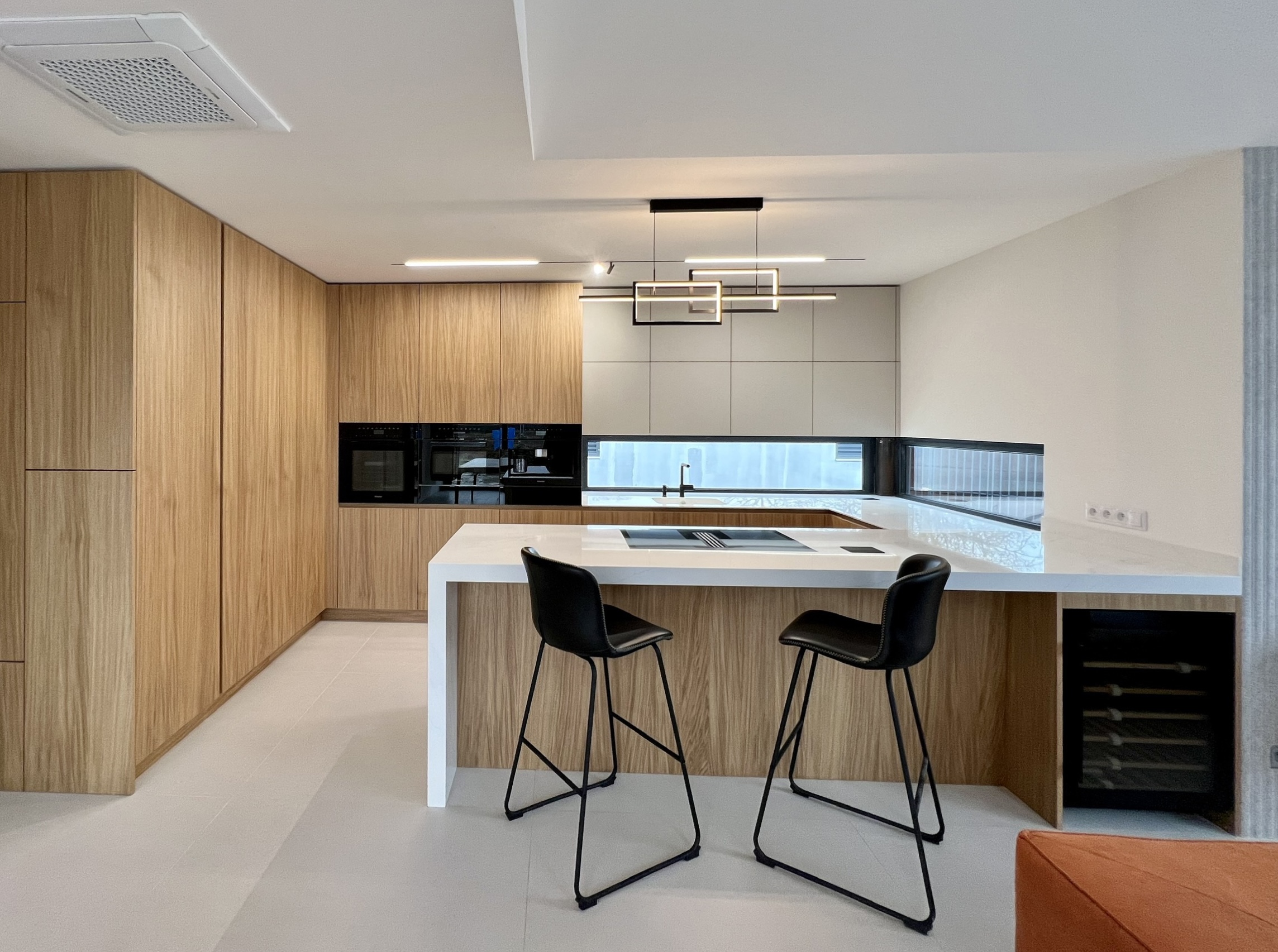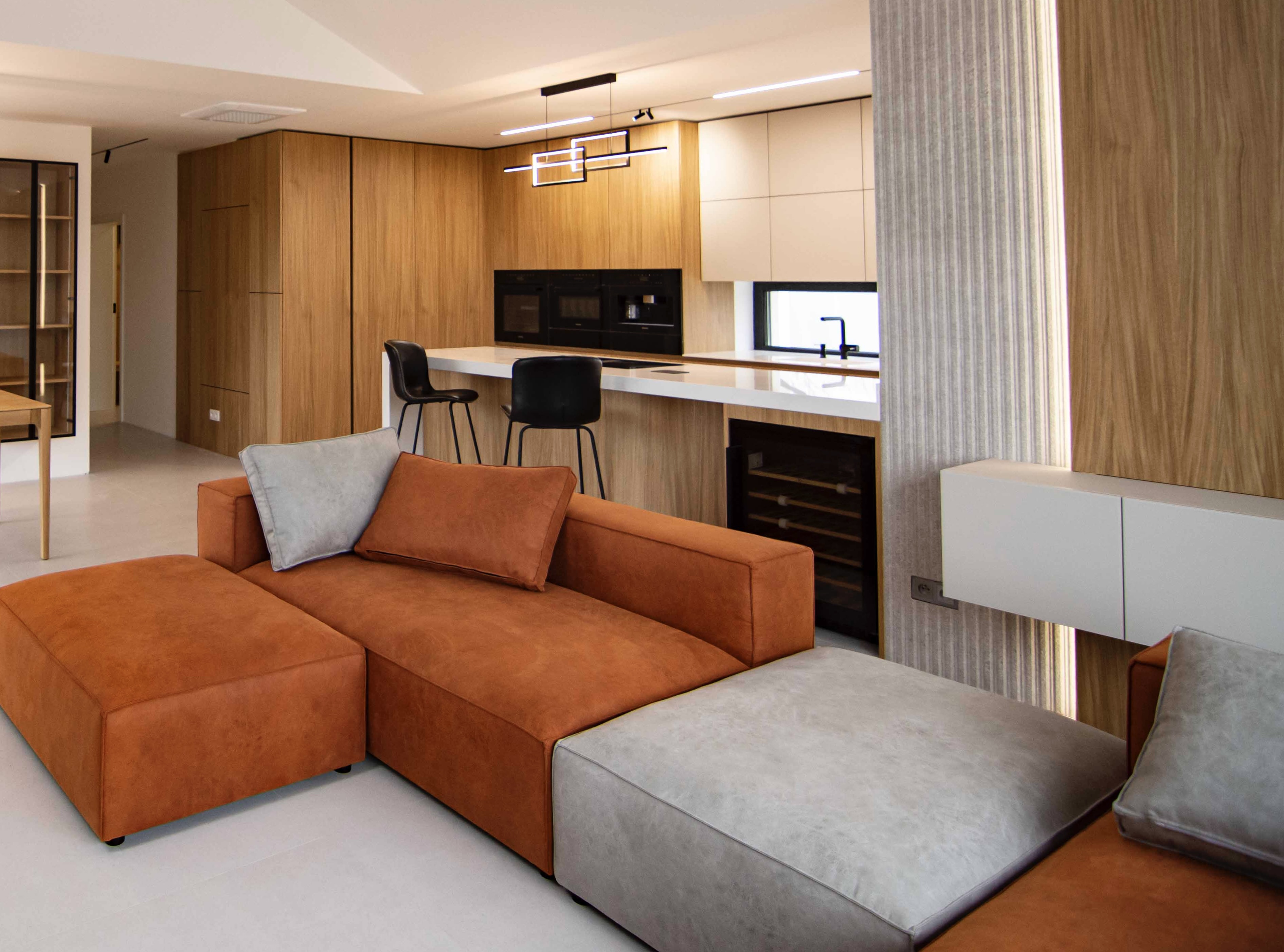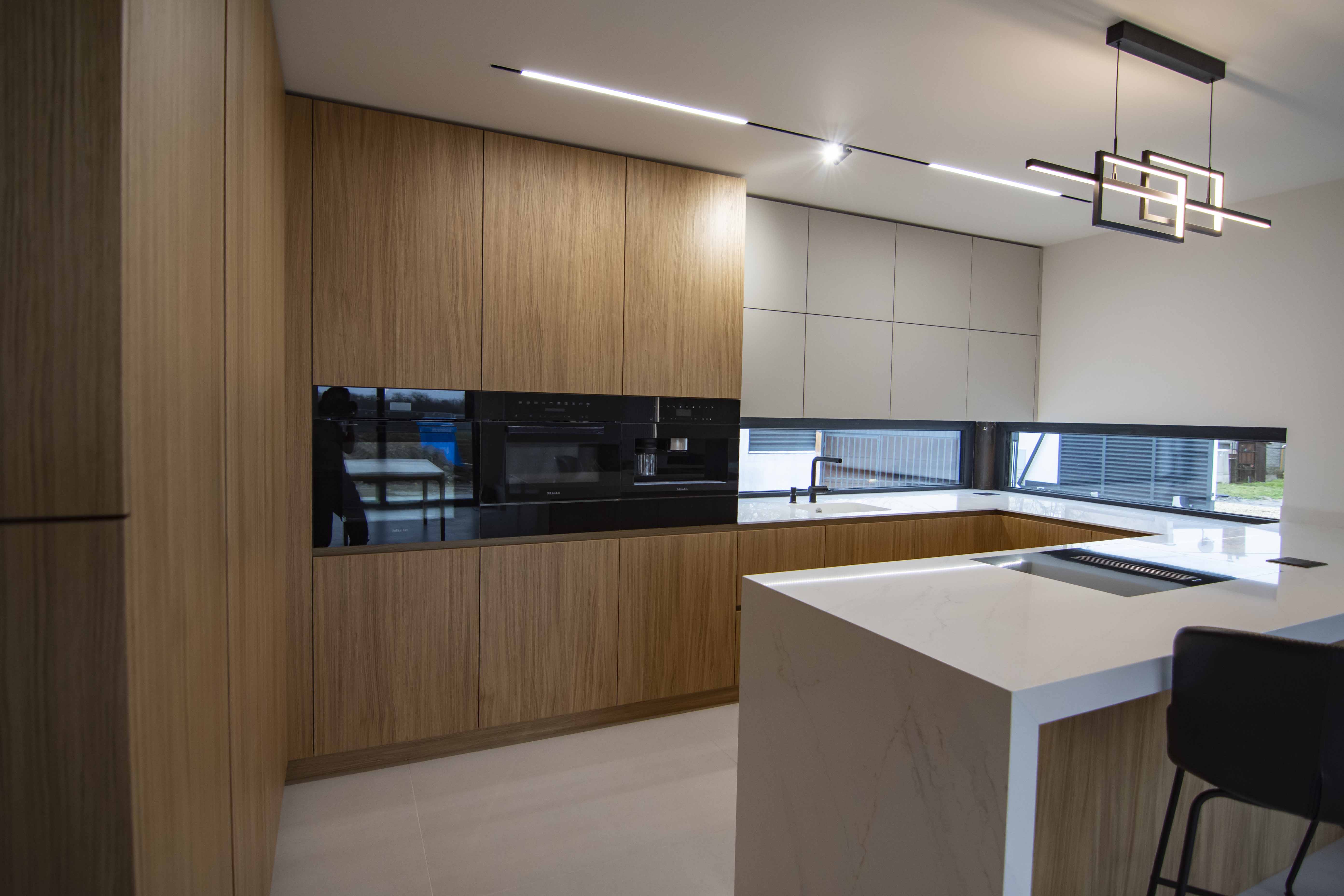 Teplo interiéru podčiarkuje drevená podlaha v rybej kosti, zatiaľ čo dizajnové svietidlo so zlatými detailmi prináša do priestoru jemný luxus a jedinečný charakter. Integrované spotrebiče a skryté úložné riešenia zabezpečujú funkčnosť bez kompromisov v estetike.