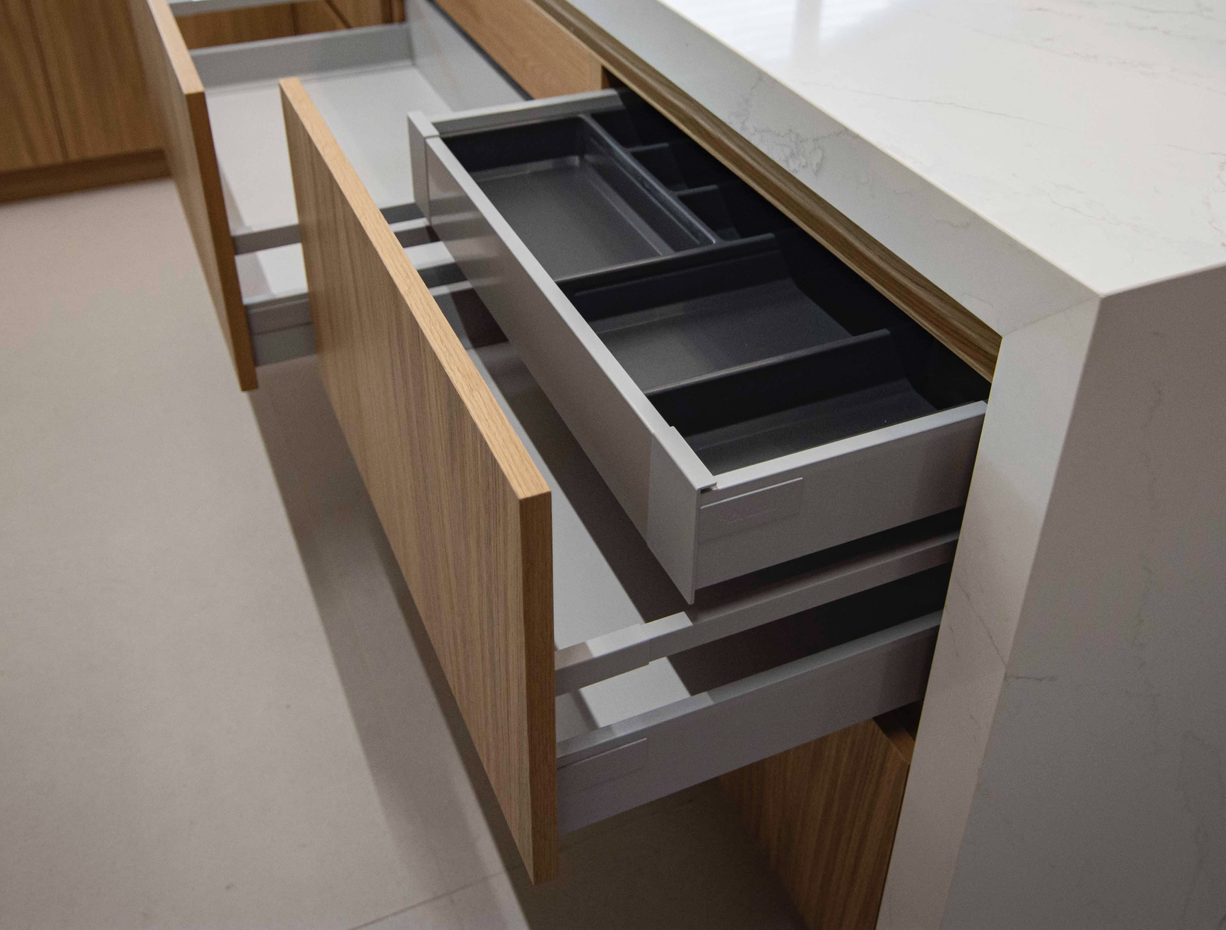 Zažite plynulý pohyb a dokonalé usporiadanie – s výsuvmi Blum premeníte každodenné otváranie zásuviek na radosť.